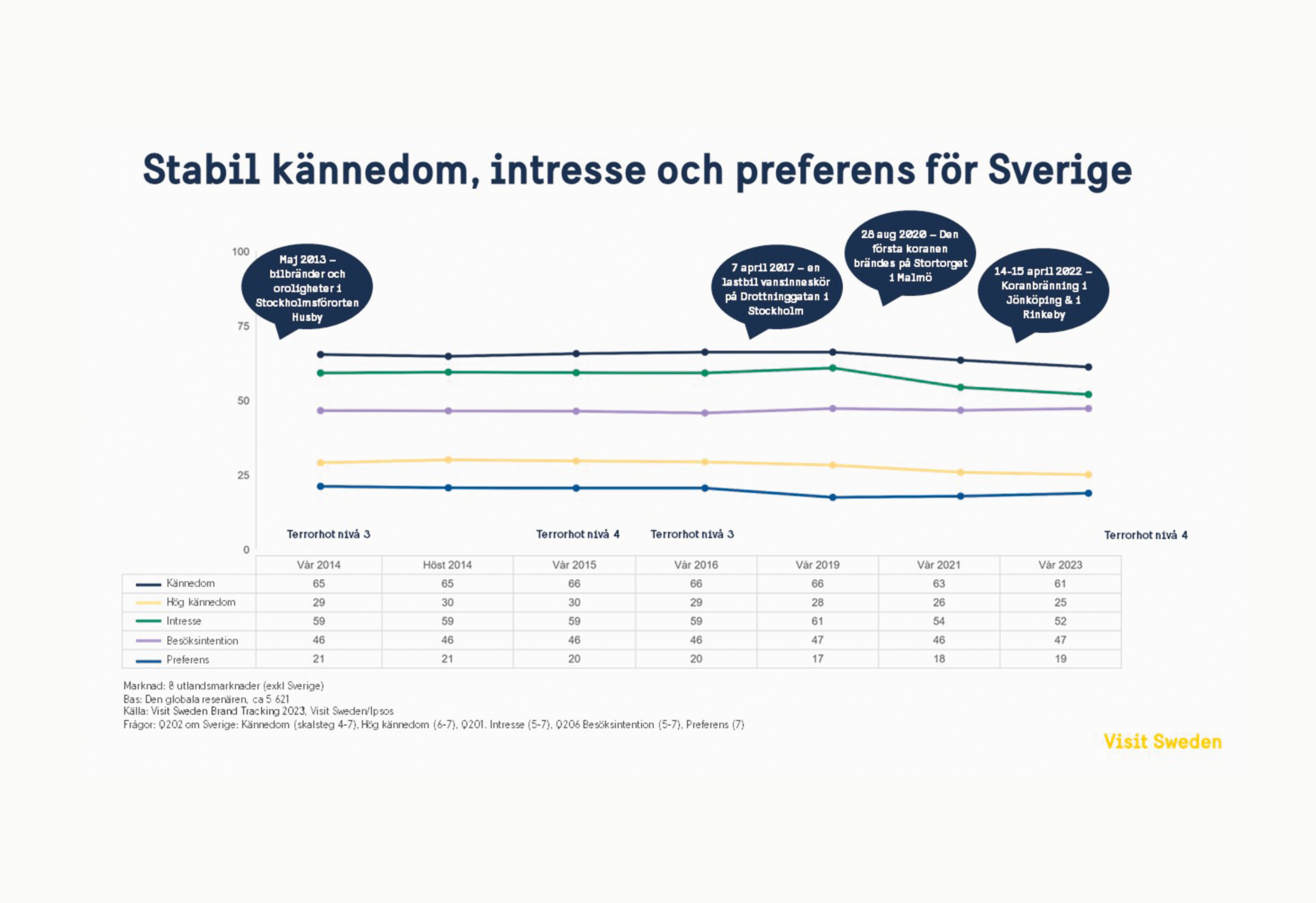 Vi ser att resenärerna på våra prioriterade marknader inte har påverkats av större händelser som lett till att vår terrorhotnivå legat högt över tid och ökat 2015. Årets undersökning genomfördes före terrorhotnivån höjdes 2023 [1].