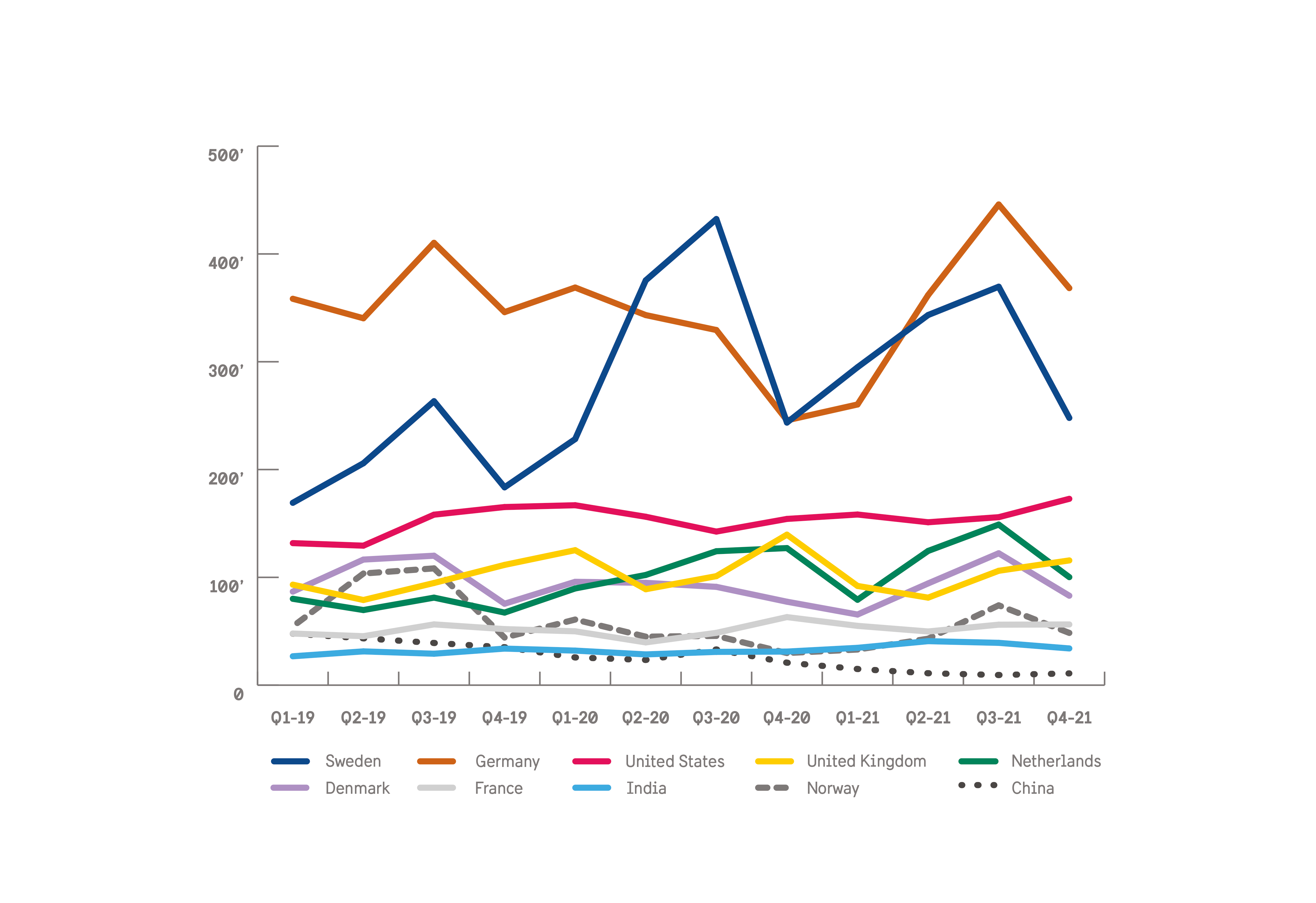Vi kan konstatera att intresset och nyfikenheten för Sverige som resmål ökar trots fortsatt begränsande reserestriktioner i världen. Ökningarna är ackumulerade siffror för 2021 jämfört med 2019. De länder Visit Sweden marknadsför Sverige som resmål i är: Sverige, Norge, Danmark, Tyskland, Nederländerna, Storbritannien, Frankrike, USA, Indien, Kina och de är också på de marknaderna vi följt Google-sökningarna.