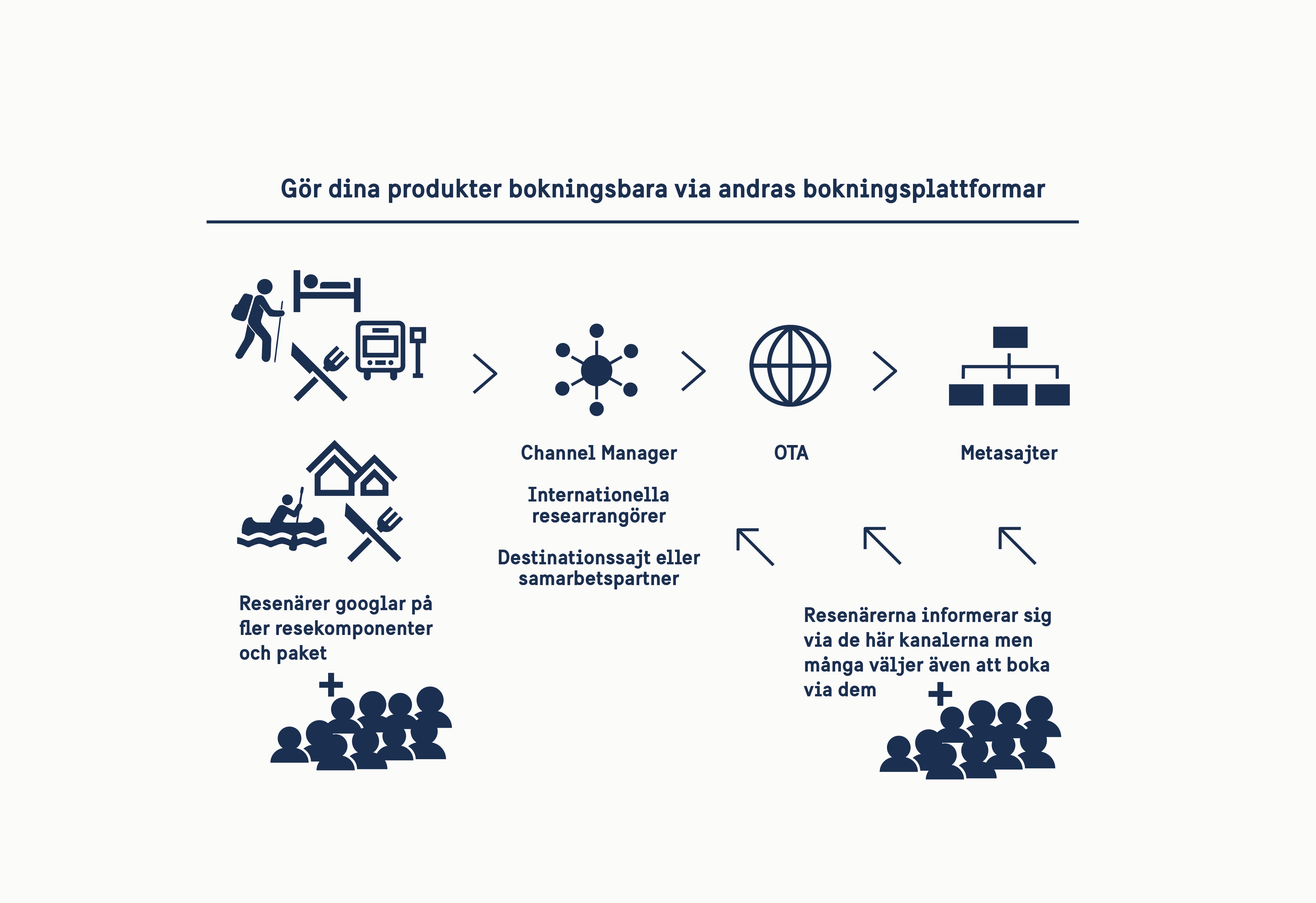 - eller sälja via andras plattformar, som exempelvis bokningssajter, jämförelsetjänster eller samarbetspartners.